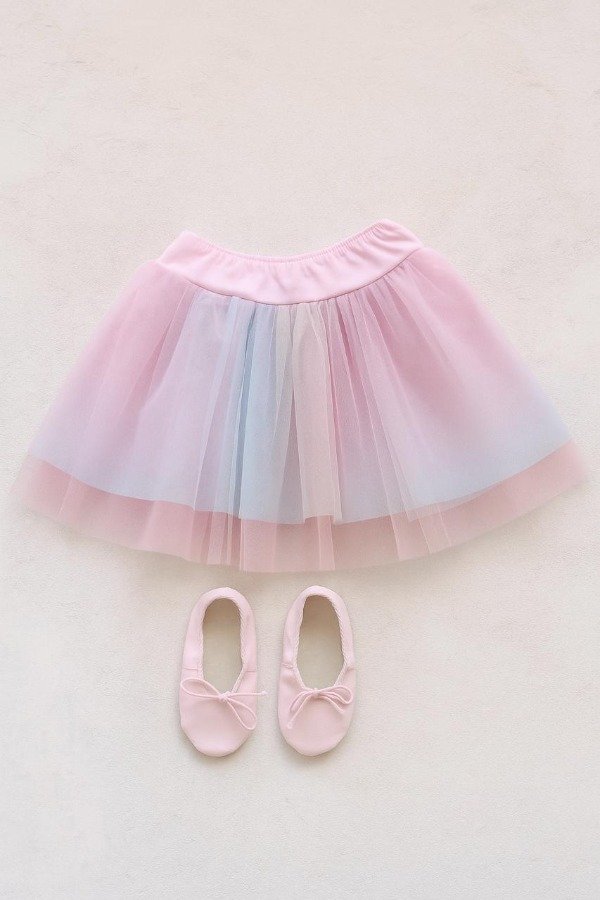 Tutu de tul, cintura de tricot elastizado y una capa estilo arcoiris/nube.